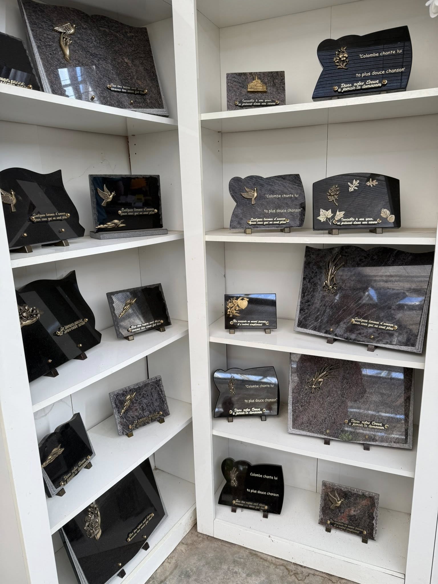 Plaques funéraires Nous proposons une large gamme de plaques funéraires en différentes formes et tailles, conçues pour répondre à toutes les préférences. Faciles à personnaliser, elles permettent d’honorer la mémoire de vos proches avec sobriété et élégance. Faites confiance à notre savoir-faire pour un hommage digne et respectueux.